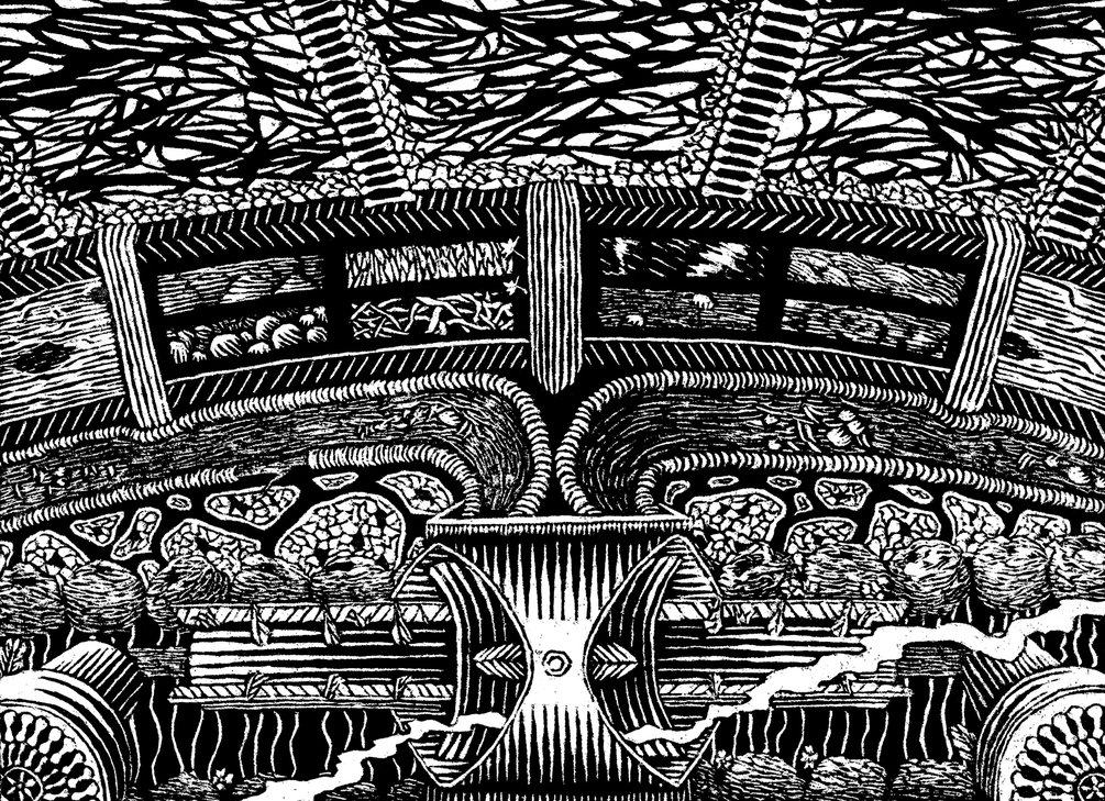 woodcut with digital text